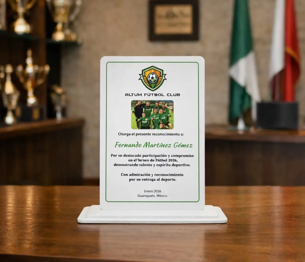 Cuenta con impresión a color, que realza la información personalizada y le da un acabado elegante y profesional. Es una pieza duradera, resistente y de gran presencia visual, perfecta para eventos corporativos, premiaciones,