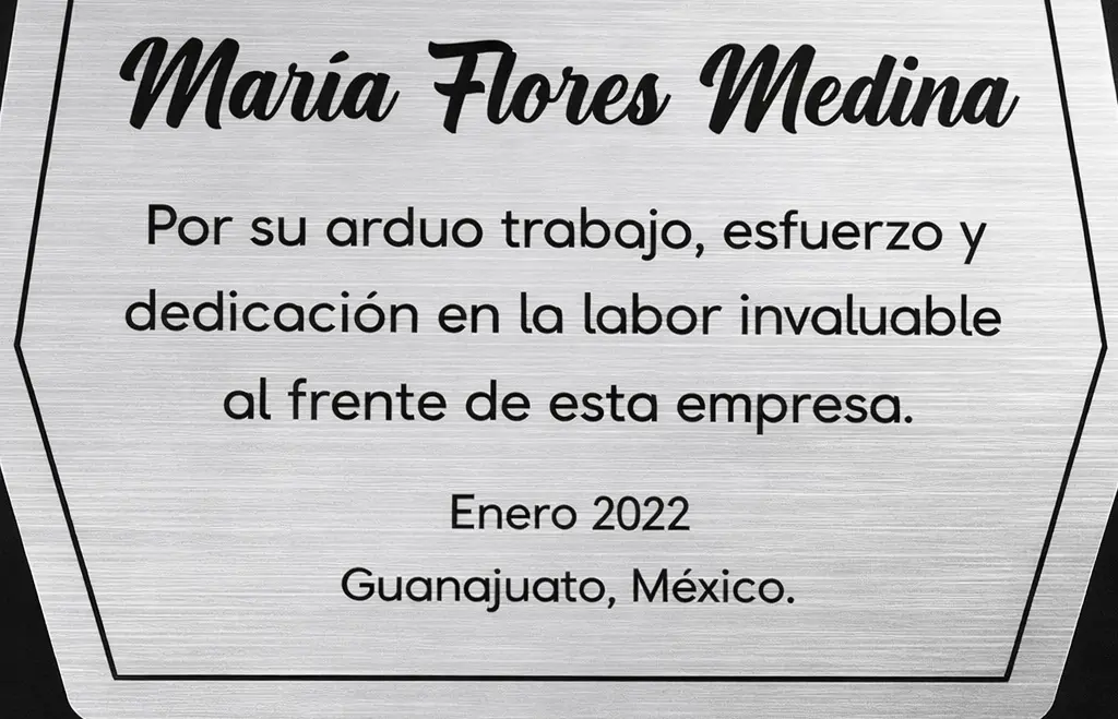 Cuenta con una placa grabada con textura metalizada, que realza la información personalizada y le da un acabado elegante y profesional. Es una pieza duradera, resistente y de gran presencia visual, perfecta para eventos corporativos, premiaciones, aniversarios o reconocimientos institucionales.