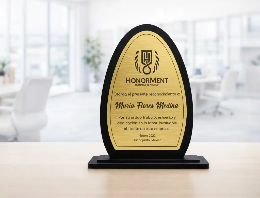Reconocimiento de escritorio con diseño tipo ovalado, elaborado en acrílico de alta calidad, ideal para destacar logros, reconocimientos o agradecimientos especiales. Su forma moderna y estilizada aporta un toque sofisticado que luce perfectamente en oficinas, escritorios o vitrinas.
